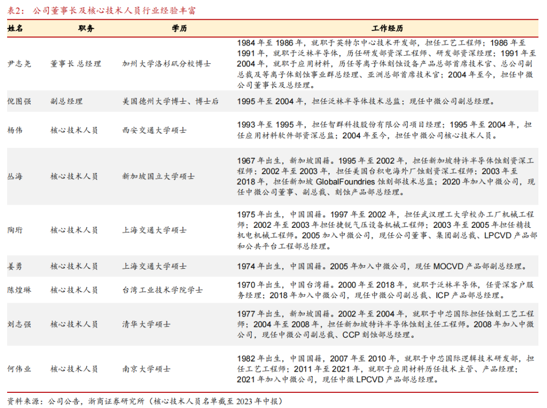 管理团队技术背景深厚,拥有丰富的行业经验。公司创始人、董事长及总经理尹志尧博士有近40年半导体行业经验,在创办公司之前在英特尔、泛林半导体从事核心技术开发工作、在应用材料担任高级管理职务,是89项美国专利和 200多项其他海内外专利的主要发明人。公司核心技术人员大部分具有国际知名半导体设备公司如泛林半导体、应用材料或知名Fab厂工作经历,拥有丰富经验和国际视野,是行业内资深的技术专家和管理专家。