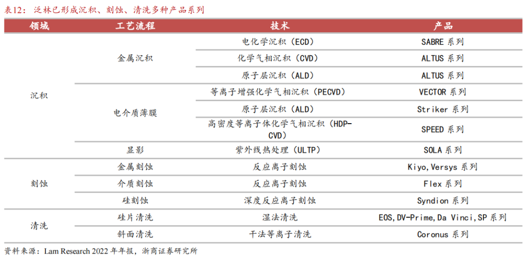泛林主要经营沉积、刻蚀和清洗设备。泛林产品涵盖金属薄膜沉积、电介质薄膜沉积、显影、金属刻蚀、介质刻蚀、硅刻蚀、清洗和检测等工艺流程,产品系列丰富多样。