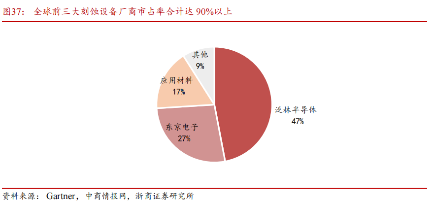 全球半导体刻蚀设备市场由美日厂商主导,呈现寡头垄断格局。刻蚀设备市场长期以来由国际巨头主导,据Gartner统计,全球前三大刻蚀设备厂商泛林半导体(Lam Research)、东京电子(TEL)、应用材料(AMAT)的市场占有率合计达90%以上。其中,泛林半导体占比居于首位,达到47%,远高于其他厂商;东京电子和应用材料分别列居二、三位,占比分别为27%和17%。