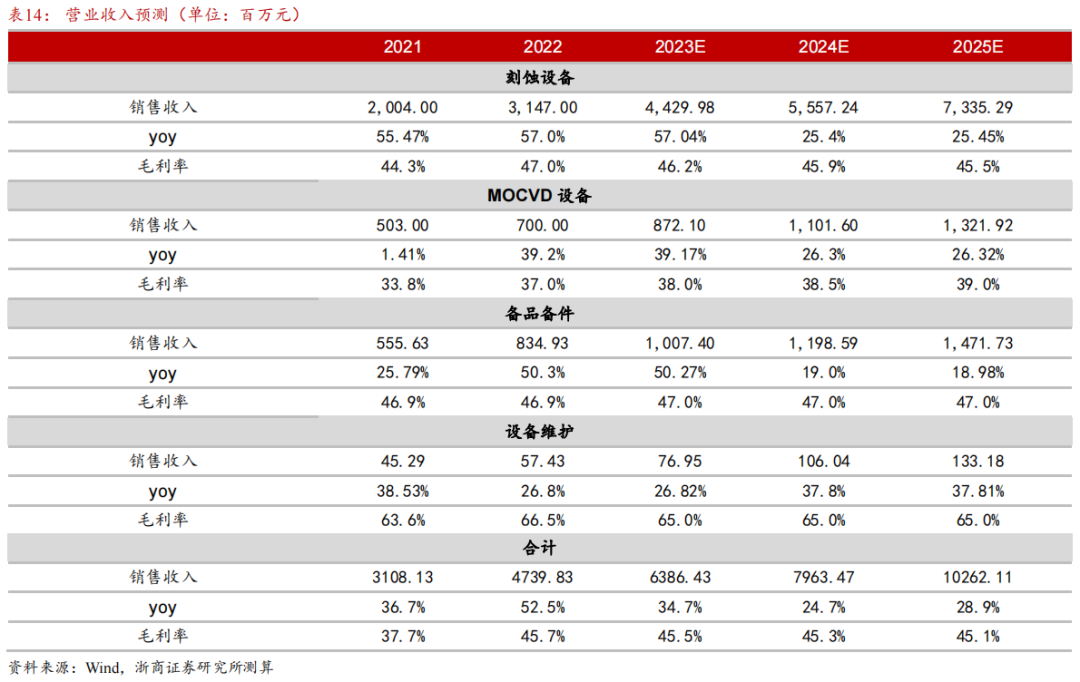 刻蚀设备:刻蚀设备是公司目前最核心的业务,营收占比最大。考虑到1)半导体行业下游晶圆厂积极产能扩张;2)半导体设备国产化率逐渐提升;3)公司CCP和ICP刻蚀设备技术行业领先,可不断满足芯片制程升级对设备技术的要求,公司刻蚀设备市场份额有望快速提升。预计2023-2025年公司刻蚀设备营业收入分别为44.3、55.6、73.4亿元,同比增长40.8%、25.4%、32.0%。随着公司刻蚀设备市占率持续扩大,预计公司毛利率维持稳定,2023-2025年刻蚀设备毛利率分别为46.2%、45.9%、45.5%。MOCVD设备:公司 MOCVD 设备目前在氮化镓基LED领域已经处于领先地位。传统LED照明市场趋于饱和,但受益于下游Mini LED的发展,MOCVD设备重新迎来需求高潮。同时,公司新推出了用于氮化镓功率器件生产的 MOCVD 设备,并启动了用于碳化硅功率器件的MOCVD设备的研发,以满足市场对两种功率器件的需求。预计2023-2025年公司MOCVD设备收入分别为8.71、11.1、13.2亿元,同比增长24.6%、26.3%、20.0%。考虑到用于Mini LED的MOCVD设备占比逐渐上升,预计2023-2025年毛利率有望分别提升至38.0%、38.5% 、39.0%。备品备件:随着公司营收规模不断扩大,预计备品备件的销售收入将保持稳定增长,预计2023-2025年备品备件收入分别为10.1、12.0 、14.7亿元,同比增长20.7%、19.0%、22.8%。毛利率也将维持相对稳定,预计2023-2025年毛利率为47%。 设备维护:随着公司产品持续导入客户端,带动下游客户设备维护需求增长,预计2023-2025年设备维护收入0.77、1.06、1.33亿元,同比增长34.0%、37.8%、25.6%,毛利率预计维持在65%。综上,我们预计2023-2025年公司营业收入分别为63.86、79.63、102.62亿元,同比增长34.7%、24.7%、28.9%,预计2023-2025年公司整体毛利率分别为45.5%、45.3%、45.1%。