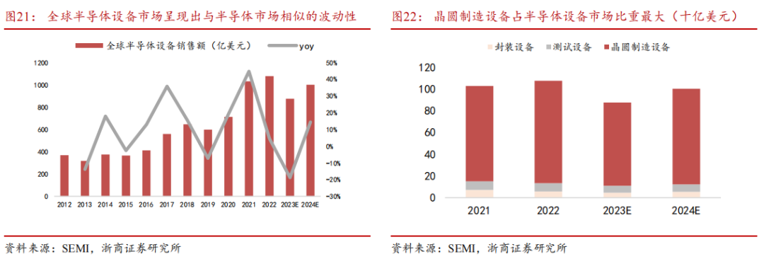 全球半导体设备市场呈现出与半导体市场相似的周期性波动,2024年有望开启新一轮周期上行。据SEMI统计,2022年全球半导体设备销售额为1074亿美元,同比+5%,连续三年创下新高,预计2023年全球半导体设备销售额将下滑至874亿美元,2024年在前后端的共同推动下有望复苏至1000亿美元。