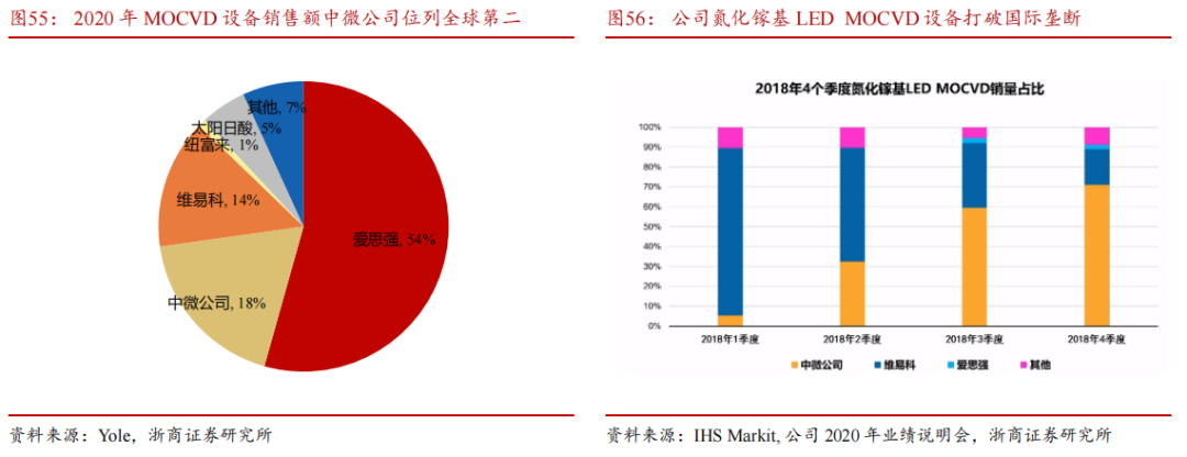 3.4 公司MOCVD设备布局行业前沿,在氮化镓基LED领域市场份额第一全球MOCVD设备三强占据近90%份额,公司打破垄断成为LED MOCVD龙头。全球MOCVD设备市场长期以来由德国爱思强、美国维易科垄断。爱思强设备主要应用领域为功率器件、激光、特殊LED和射频器件,维易科设备销售主要应用于GaN、GaAs基的LED。2017年公司推出高性能MOCVD设备Prismo A7,打破了两者垄断格局,成为全球氮化镓基 LED 市场份额最大的 MOCVD 设备商 ,2018年下半年市场占有率达到60%以上,并持续在行业内保持领先地位。