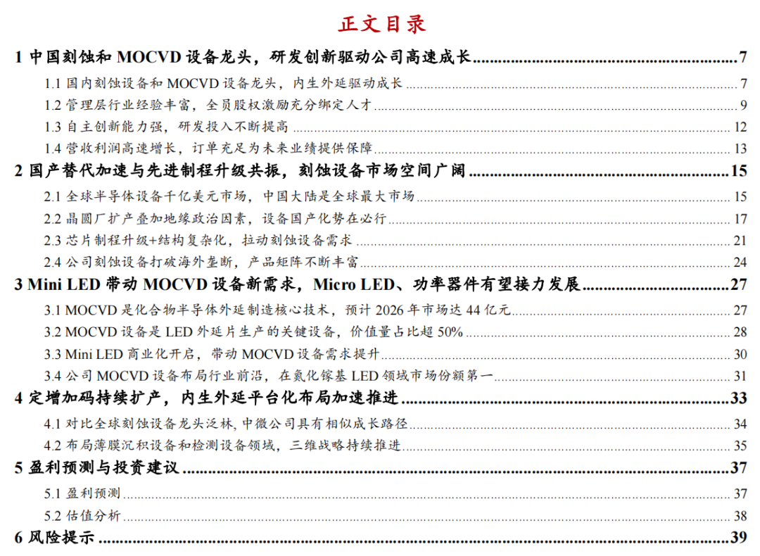 2)半导体设备国产化加速,公司刻蚀设备市占率不断提升; 3)Mini LED促进MOCVD设备需求,Micro LED与功率器件领域的发展带动MOCVD设备接续放量。
