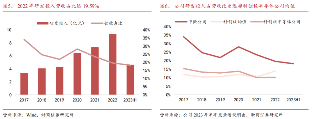 高度重视研发,2022年研发投入占营收比重达20%。公司高度重视核心技术的创新,投入大量研发费用开发、设计和制造刻蚀设备、薄膜沉积设备、 MOCVD设备等。近年来公司研发投入不断提升,2022年研发投入9.3亿元,占营收比重约20%。公司保持高研发投入且不断增加,研发投入占比远超科创板半导体公司均值。