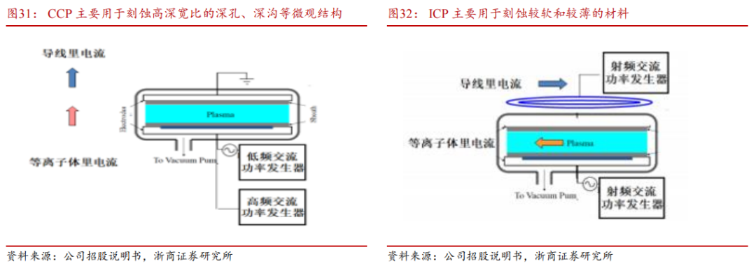 等离子体干法刻蚀是当前主导的刻蚀技术。刻蚀可以分为湿法刻蚀和干法刻蚀,湿法刻蚀主要是用液体化学试剂以化学的方式去除硅片表面的材料,其各向异性较差,侧壁容易产生横向刻蚀,导致刻蚀后图形的分辨率下降,造成刻蚀偏差,应用场景较少,常用于工艺尺寸较大的应用或干法刻蚀后清洗残留物等。干法刻蚀主要是通过等离子体与硅片发生物理或化学反应从而将表面材料去除,其各向异性好于湿法刻蚀,是当前的主流刻蚀技术,其中以等离子体干法刻蚀为主导。根据产生等离子体方法的不同,干法刻蚀主要分为电容性等离子体刻蚀(CCP)和电感性等离子体刻蚀(ICP),这两种刻蚀设备涵盖了主要的刻蚀应用。等离子体刻蚀设备的工作原理是利用等离子体放电产生的带化学活性的粒子,在离子的轰击下,与表面的材料发生化学反应,产生可挥发的气体,从而在表面材料上加工出微观结构。根据产生等离子体方法的不同,干法刻蚀可分为电容性等离子体刻蚀和电感性等离子体刻蚀。其中CCP刻蚀主要是介质刻蚀,即高能离子在较硬的介质材料上刻蚀高深宽比的深孔、深沟等微观结构;而ICP刻蚀主要是硅刻蚀和金属刻蚀,即以较低的离子能量和极均匀的离子浓度刻蚀较软的和较薄的材料。ICP、CCP在整个刻蚀设备市场占比接近,据Gartner数据显示,2022年ICP、CCP占刻蚀设备市场分别为47.9%、47.5%,二者合计占比约95%,几乎占据了整个刻蚀设备市场全部份额。