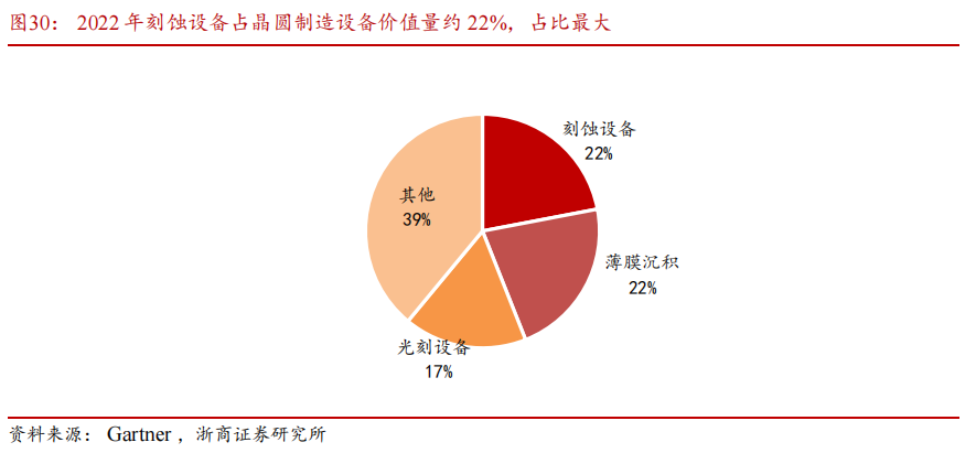 刻蚀、薄膜沉积、光刻设备是集成电路制造三大核心设备。据 Gartner 统计,2022年,全球刻蚀设备、薄膜沉积和光刻设备分别占晶圆制造设备价值量约 22%、 22%、 17%,是占比最大的三类设备,其中刻蚀设备和薄膜沉积设备价值量占比最大。