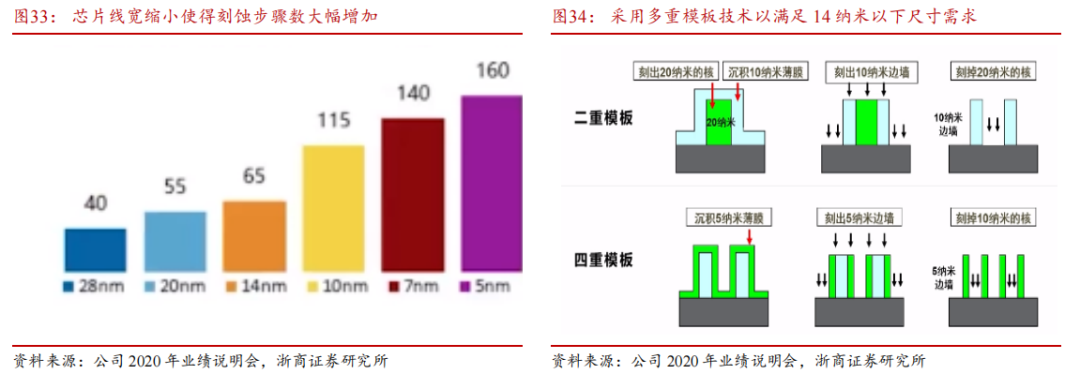 在逻辑器件领域,芯片线宽缩小使得工序步骤大幅增加,需采用多重模板工艺来满足尺寸要求。国际上高端芯片制程从7-5 nm向3nm、2nm更小方向升级,当前沉浸式光刻机受光波长的限制,关键尺寸无法满足要求,需要采用多重模板技术,重复多次薄膜沉积和刻蚀工序以实现更小的线宽,使得薄膜沉积和刻蚀次数显著增加,相关设备重要性也进一步提升。据公司2020年业绩说明会,20 nm工艺大约需要55次刻蚀,而10纳米及以下尺寸所需刻蚀步骤则超过100次。工序步骤的大幅增加带动刻蚀设备需求相应增加。
