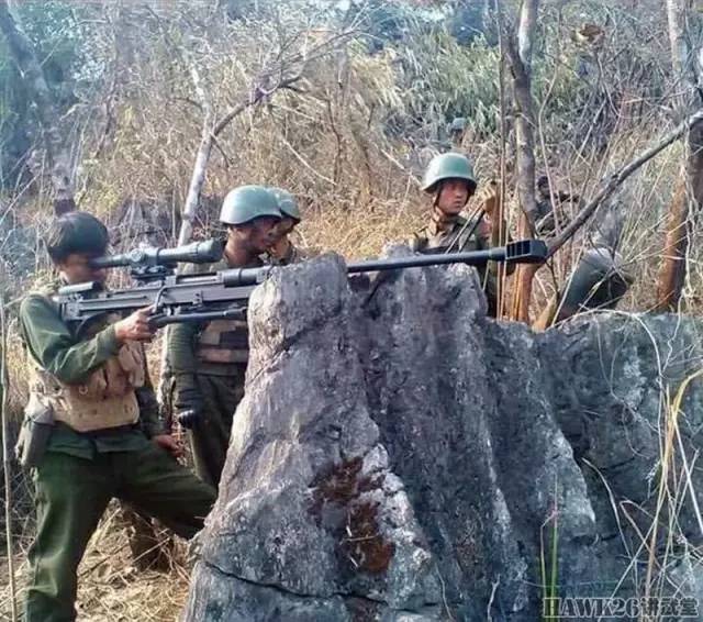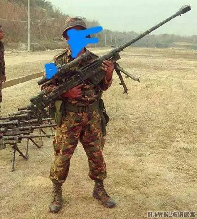 从缅甸士兵的绿色制服上来看,这张照片拍摄时间更早。不过缅甸军队正在逐步换装,依旧有部分单位还穿着老军服,因此不能说这些照片拍摄时间早很多。该枪没有迷彩,因此机匣上的细节可以看得更清楚。