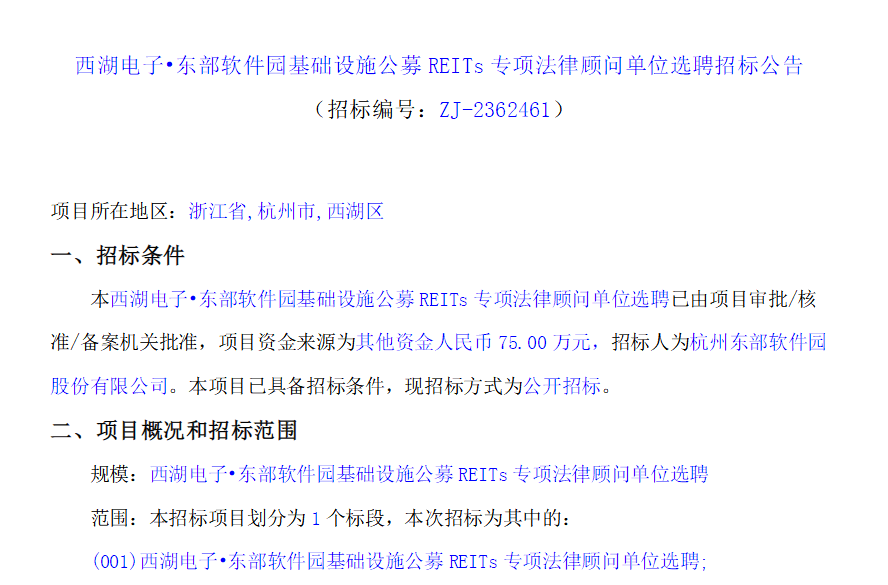 2023年8月30日,西湖电子•东部软件园基础设施公募REITs专项法律顾问单位选聘招标公告,项目资金来源为其他资金人民币75.00万元,招标人为杭州东部软件园股份有限公司。本项目已具备招标条件,现招标方式为公开招标。