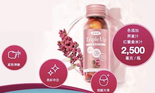 每瓶含2500毫克专利红藜麦米汁,并采用全谷红藜萃取,保留其完整活性成分,该萃取物有助于促进胶原蛋白生成,保护年轻肌肤。