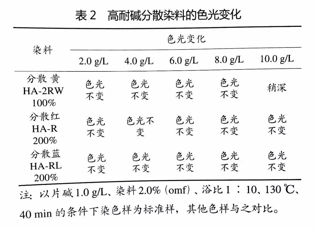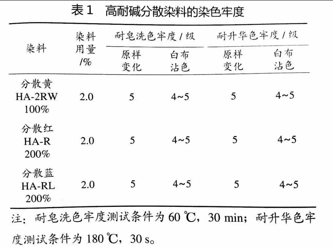 选取耐碱分散染料三原色分散黄HA-2RW100%、分散红HA-R200%、分散蓝HA-RL200%作为代表,测试其在碱性条件下的染色牢度,结果见表1。从表1可以看出,高耐碱分散染料三原色在碱性条件下染色的各项牢度均在4级以上,达到或超过常规两浴法染色的牢度,能够满足印染厂的牢度要求。