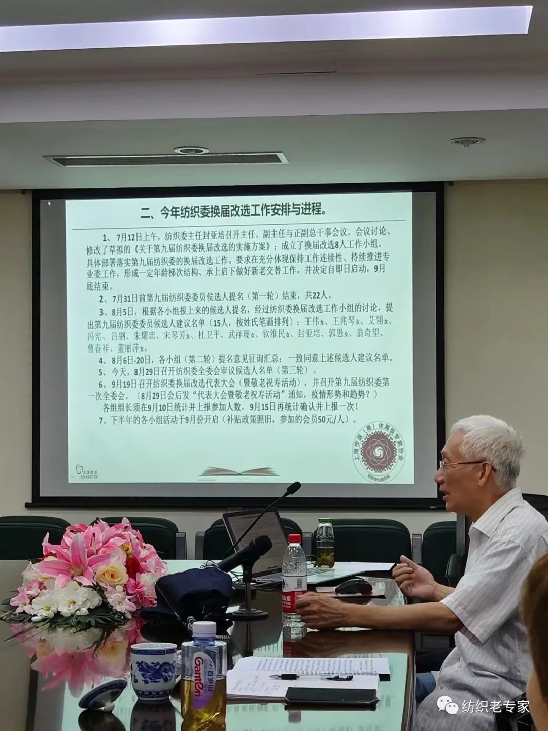 二、会议审议通过了第九届纺织委15位委员候选人名单。会上对封亚培、杜卫平、冯宪、艾翎、朱耀忠、宋琴芳、吕钢、郭愚、翁奇望、曹春祥、王伟、钦维民、王兆琴、董丽萍、武祥珊等侯选人逐个进行简要介绍,取得一致意见。三、会议重申今年纺织委换届改选工作安排与进程,决定于9月18日召开会员代表大会。这次会议既是代表大会,也是疫情后第一次较大规模的聚会,是敬老祝寿联谊代表的复合型大会。会议确定了大会议程,明确由总干事负责筹备落实。