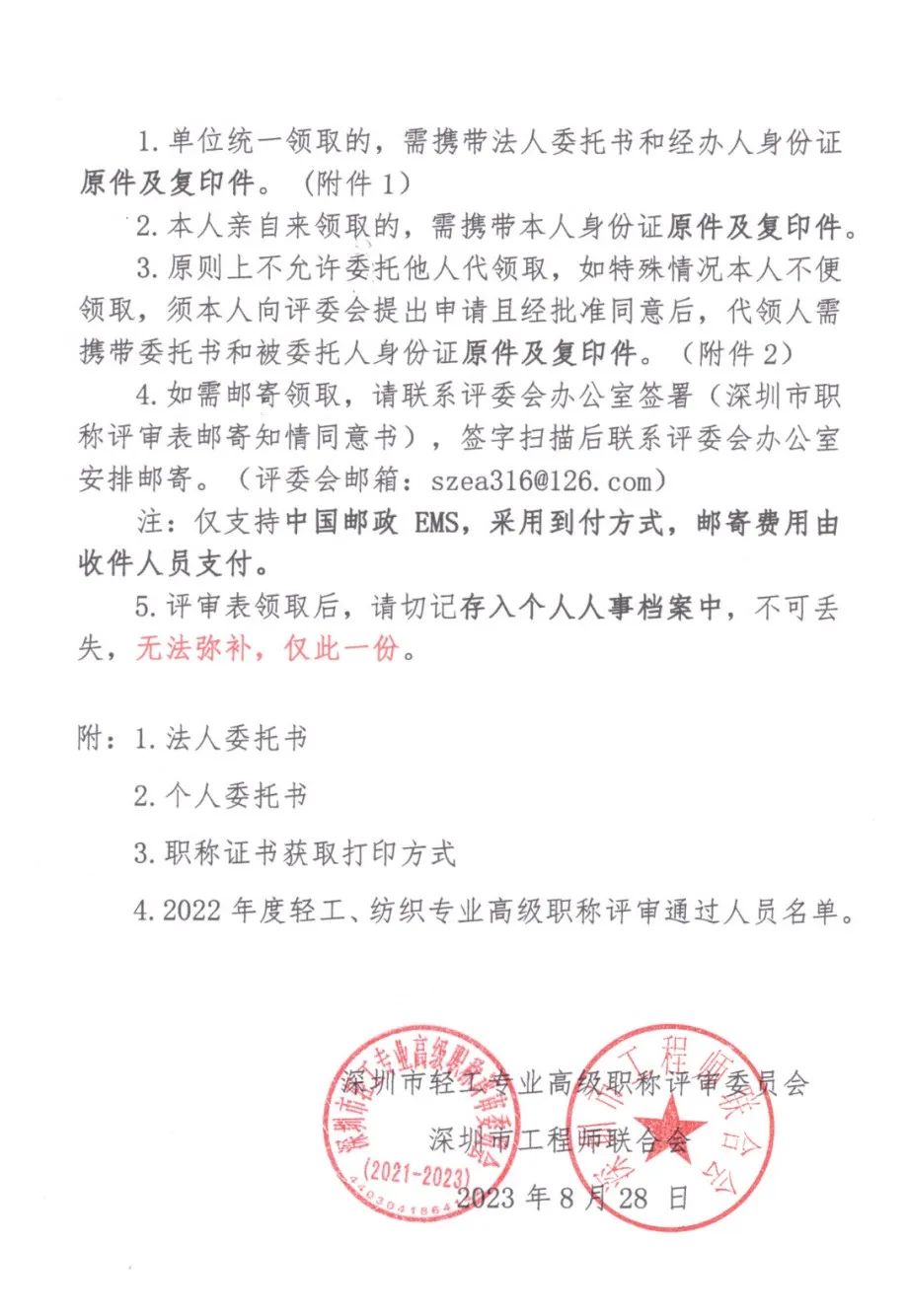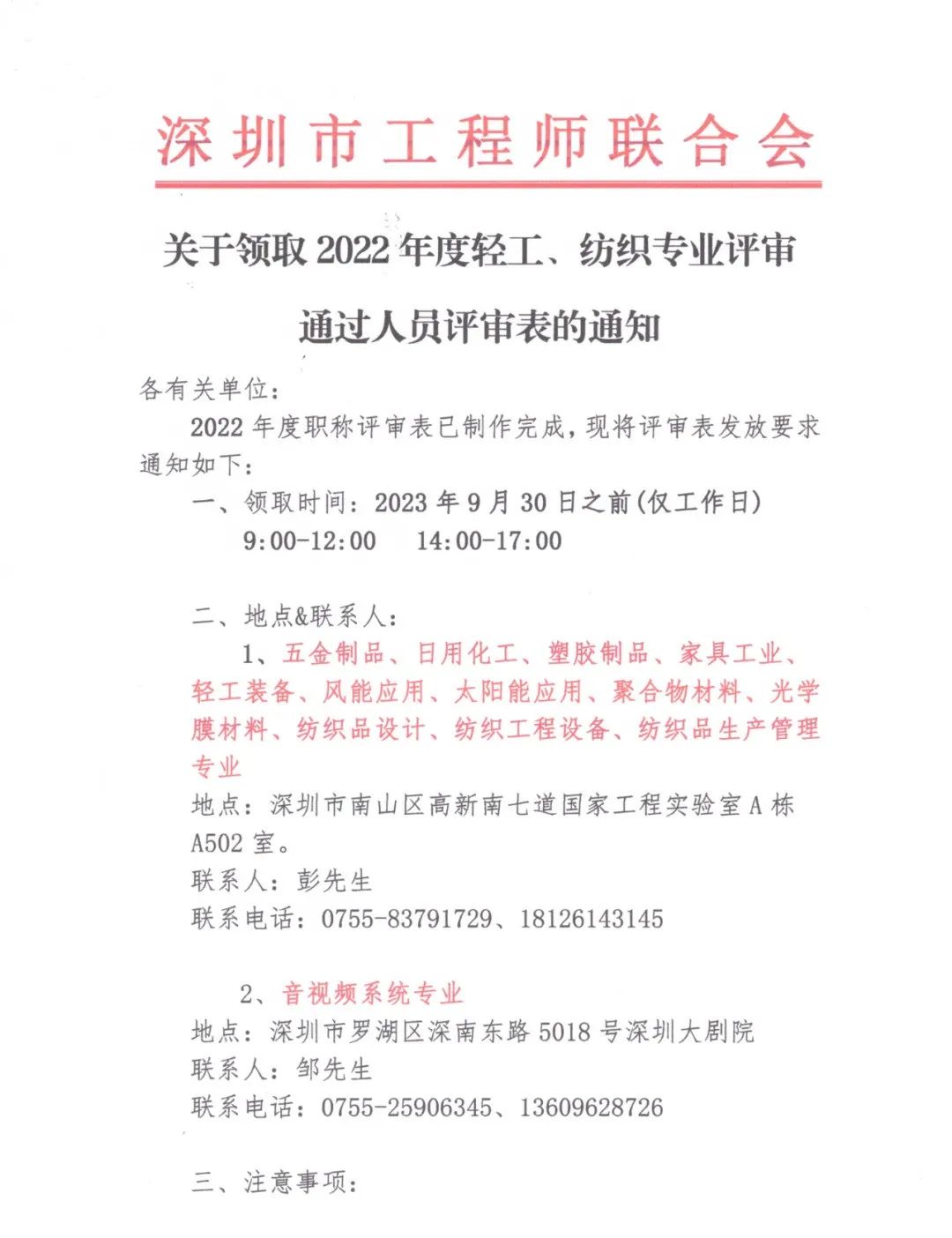 深圳市关于领取2022年轻工、纺织专业职称评审表的通知