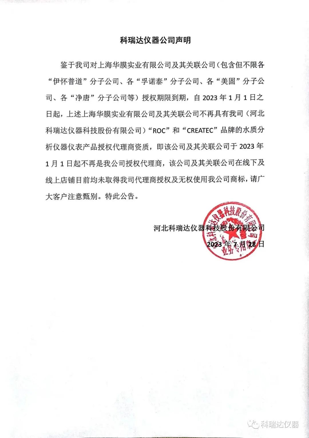 鉴于我司对上海华膜实业有限公司及其关联公司(包含但不限各“伊怀普道”分子公司、各“孚诺泰”分子公司、各“美固”分子公司、各“净唐”分子公司等)授权期限到期,自2023年1月1日之日起,上述上海华膜实业有限公司及其关联公司不再具有我司(河北科瑞达仪器科技股份有限公司)“ROC”和“CREATEC”品牌的水质分析仪器仪表产品授权代理商资质,即该公司及其关联公司于2023年1月1日起不再是我公司授权代理商,该公司及其关联公司在线下及线上店铺目前均未取得我司代理商授权及无权使用我公司商标,请广大客户注意甄别。特此公告。