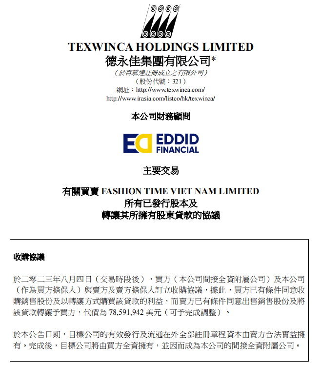 班尼路母公司德永佳集团于8月4日通过旗下间接全资附属公司永景实业有限公司收购时针越南控股有限公司,涉及金额约为7859万美元(约5.65亿人民币)。资料显示,时针越南主要从事生产针织成衣布。交易完成后,时针越南的有效发行及流通在外全部注册章程资本将由永景实业全资拥有,成为德永佳的间接全资附属公司。公司于1992年在东莞投资建厂,是德永佳集团在国内的主要生产基地之一,公司主要生产及销售各类高档针织面料及针织用色纱。产品以外销为主,客户主要为欧美、亚洲各地的国际知名品牌,客户主要分布于中国、日本、美国、欧洲等国家地区,如POLO、NIKE、GAP、BALENO、UNIQLO、ZARA、森马、安踏等知名品牌。公司紧跟行业发展新动态,开发化纤高档面料,无缝高档成衣等高附加值新型产品。