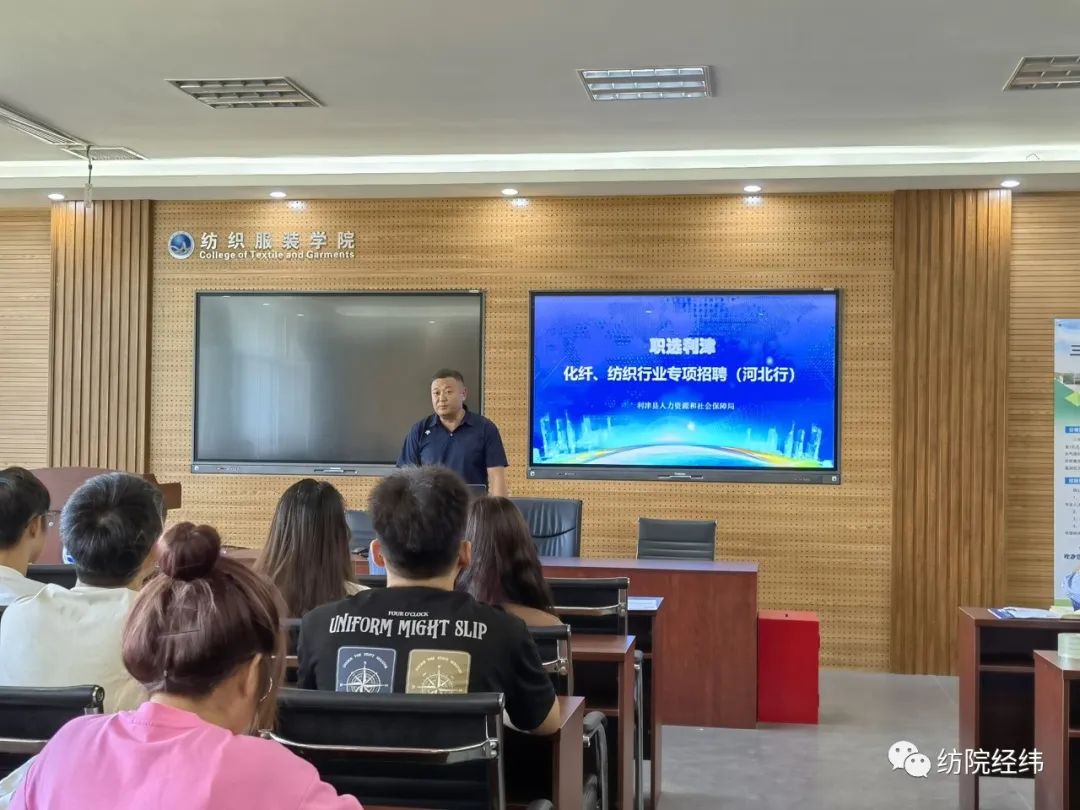 8月28日,纺织服装学院邀请山东省利津县人社局副局长张利勇、三阳纺织有限公司人力部经理刘建桥在学院220会议室进行宣讲。