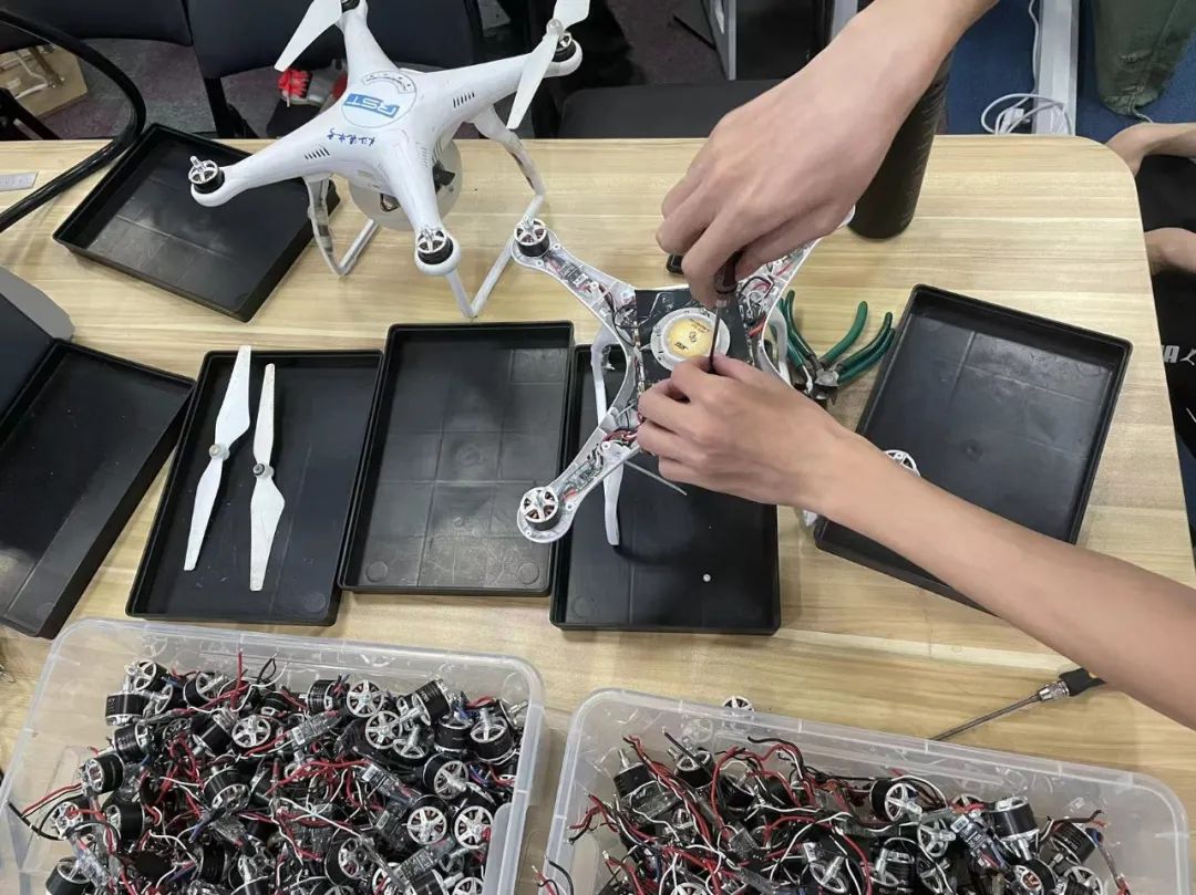 第二天的主要任务是对业务优化无人机的部件科普和拆解工作,由单位专业人员带头,组内经验丰富的同学组织并指导,全组细分成各个工作小组进一步完成业务,以工件为基础导向,对各个操作用工具,如热风枪、电烙铁等进行操作和原理上的学习,在熟悉无人机部件分别在工作中的作用的基础上对其进行拆解和分类,是作为对实习工作顺利开展第一步的学习内容和业务操作相结合开展的极具意义的实践过程;与此同时,在工具被占用的空隙,以及拆解业务工作完成后的时间,组员们开展对无人机飞行模拟器的熟悉练习,为下一次真机试飞打好基础做足准备。
