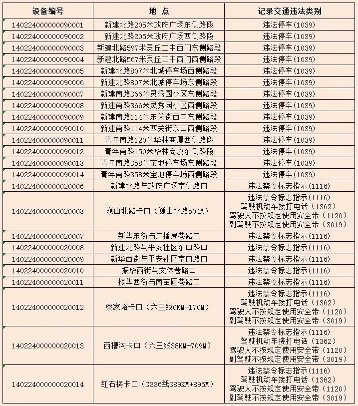 为了进一步规范灵丘县道路交通秩序,有效遏制道路交通事故的发生,减少道路交通违法行为,净化道路交通环境,根据《中华人民共和国行政处罚法》、《中华人民共和国道路交通安全法》及其实施条例,以及公安部《中华人民共和国道路交通安全违法处理程序规定》要求,灵丘县公安局交通警察大队决定启用24处交通违法电子抓拍设备。将对机动车违反禁令标志指示的、违法停车、不按规定使用安全带、接打手持电话等交通违法行为进行自动抓拍取证并依法实施行政处罚。