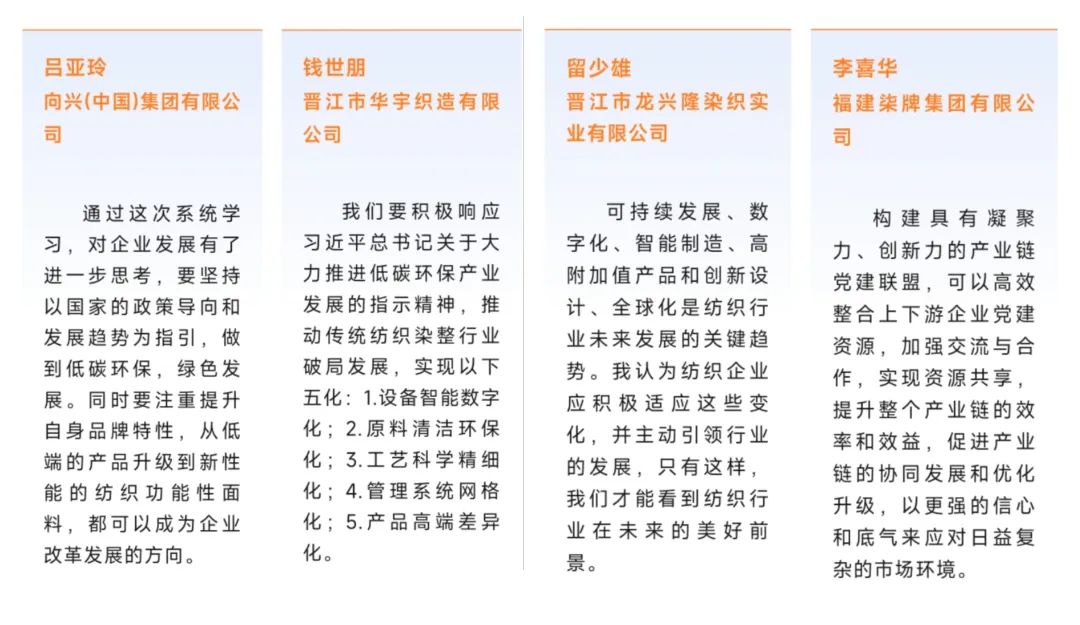 培训期间特邀东华大学研究院副院长王华平、东华理工大学马克思主义学院副院长汪斌锋,参加“纺织染整产业未来发展”“纺织染整产业链党建联盟发展”座谈沙龙,围绕如何发挥党组织在开展人才工作、服务企业发展等方面的独特优势,推进个人、企业、行业的共同发展,促进民营经济发展壮大展开交流讨论。