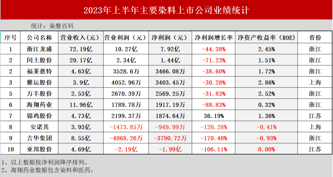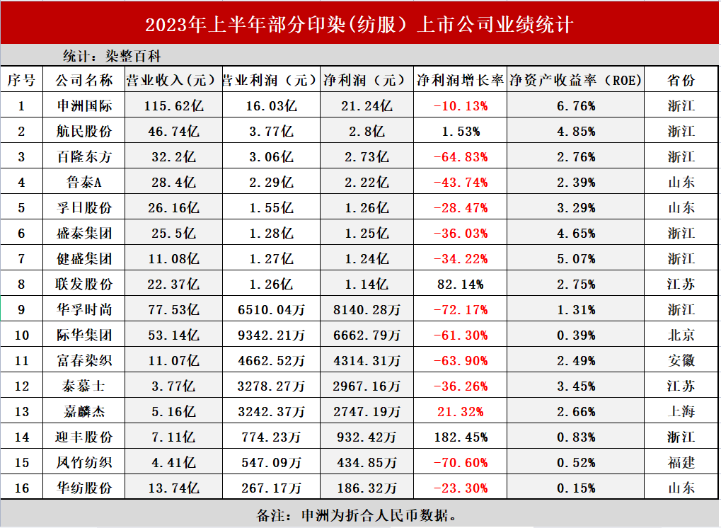 截止8月31日,有29家纺织印染行业上市公司发布半年年报,其中纺织印染为主的企业16家,染料为主的企业10家,助剂为主的企业3家:
