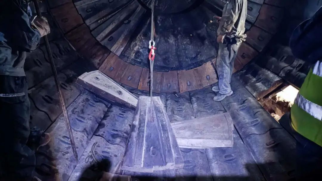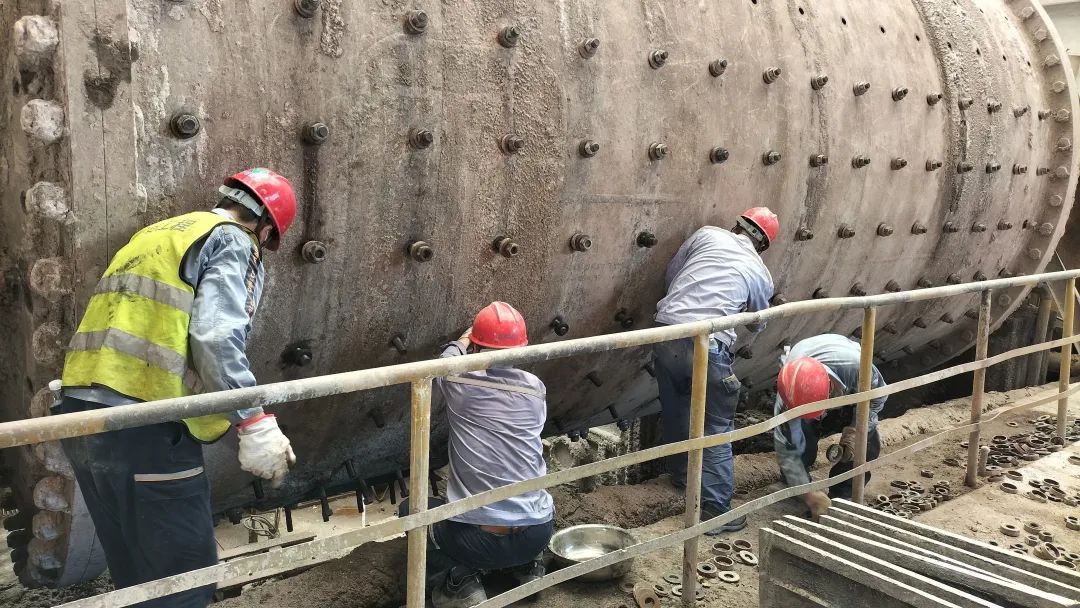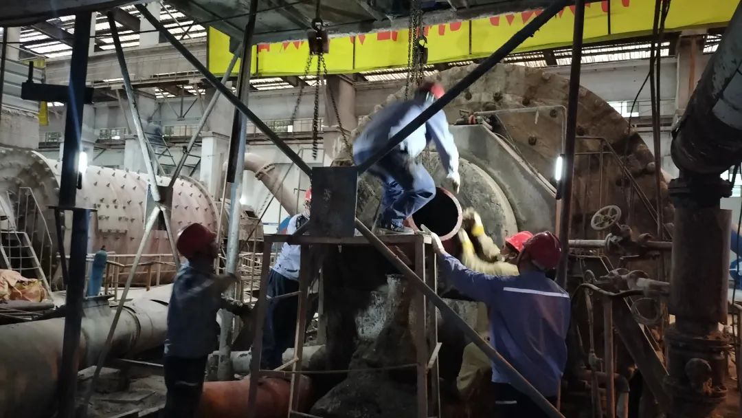 20日16:00,磨机大修正式拉开了帷幕,本次任务主线就是1#球磨全套衬板(筒体衬板240块+端盖衬板64块)的更换,由于时间紧,任务重,大家始终以积极乐观的心态和斗志昂扬的精气神去迎接每一项挑战。在磨机筒体衬板安装过程中,每一块衬板都需要几个人协力配合下才能安装到位,特别是两头端盖衬板,需要电葫芦挂着钢丝绳一点点的吊起来,在使用撬棍抬着衬板,插入端盖螺丝孔内,才能一个个穿上螺丝。不知不觉中,大家的衣衫已被汗水浸透,承载着每一块衬板安装的不易。