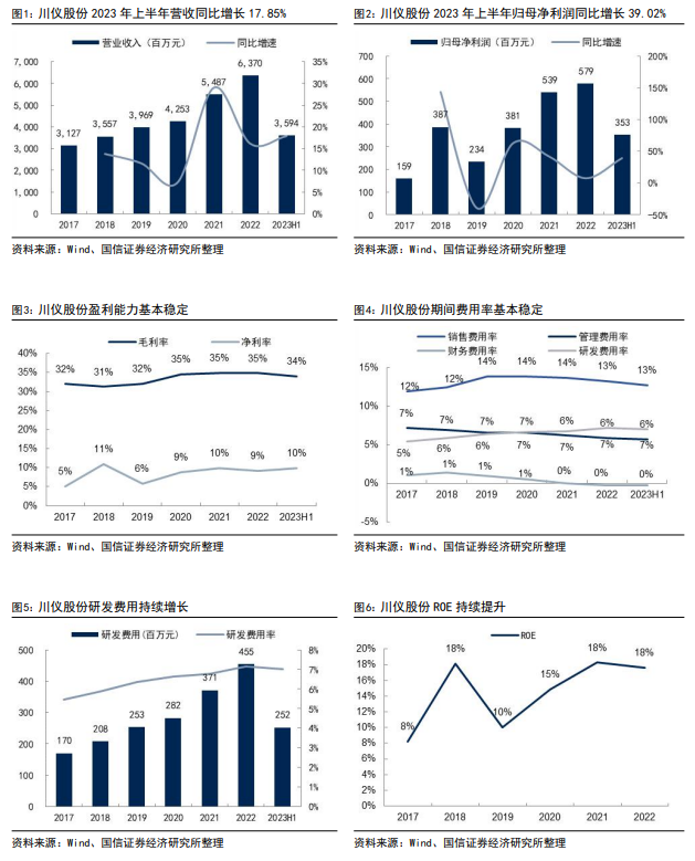 公司2023年上半年实现营收35.94亿元,同比增长17.85%;归母净利润3.53亿元,同比增长39.02%;扣非归母净利润2.98亿元,同比增长26.79%。单季度看,2023年第二季度实现营收20.34亿元,同比增长19.10%;归母净利润2.14亿元,同比增长46.65%;扣非归母净利润1.74亿元,同比增长22.47%。上半年公司主力产品智能流量仪表、智能调节阀、智能压力变送器等收入同比增长24.97%-65.24%,石油化工、装备制造、工程配套、新能源行业收入快速增长。盈利能力来看,2023年上半年公司毛利率/净利率分别为33.98%/9.87%,同比变动-0.99/+1.50个pct,盈利能力基本稳定。费用端来看,上半年销售/管理/研发/财务费用率为12.69%/5.67%/7.02%/-0.25%,同比变动-0.40/-0.32/-0.48/-0.23个pct,费用管控良好。上半年公司经营性现金流净额0.20亿元,同比大幅提升,主要系加大资金管控力度,支付现金流出减少。
