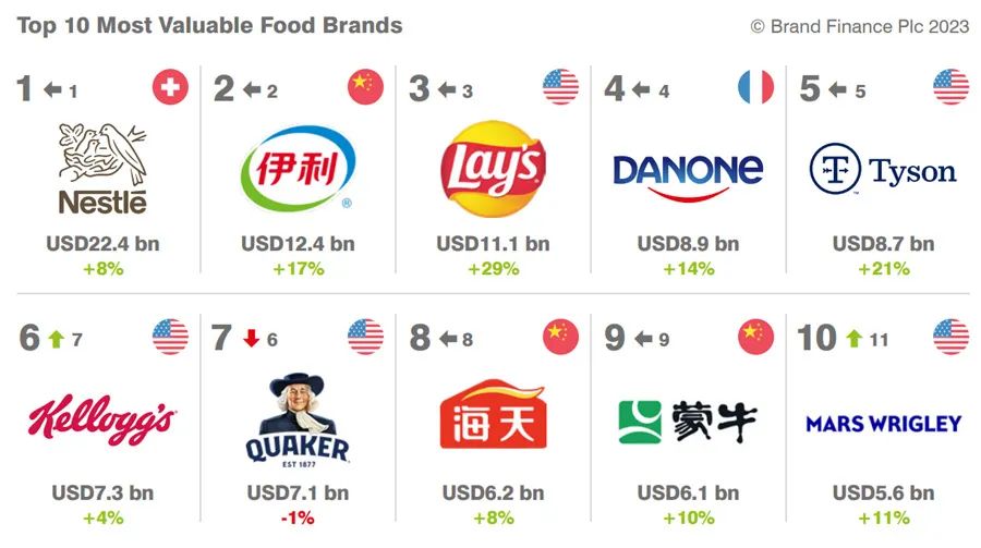 英国品牌评估机构“品牌金融”(Brand Finance)发布“2023全球食品和饮料品牌”价值报告(Food & Drink 2023)。在全球食品品牌价值100强(Food 100)榜单上,雀巢、伊利、乐事蝉联前三位。