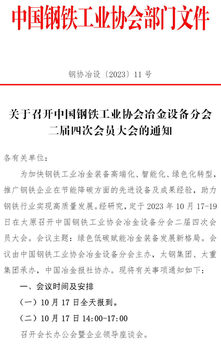 关于召开中国钢铁工业协会冶金设备分会二届四次会员大会的通知