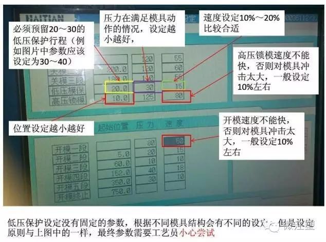 a 在能合上模具的前提下低压压力应设定尽可能低,只要能可靠抵消合模之磨擦阻力(模板与导柱之磨擦阻力,动定模接触后导柱导套磨擦阻力,斜导柱滑块之磨擦阻力,还有动模板与支撑部件之磨擦阻力等等)即可