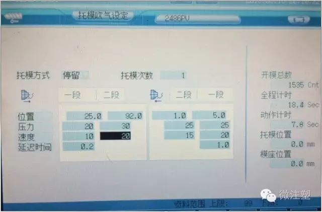 顶出行程同样取决于模具的大小,只要能够方便快速的取出产品,顶出行程设定越小越好以缩短成型周期
