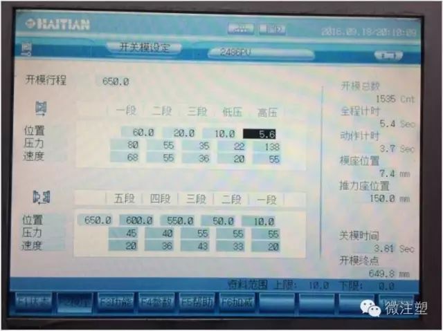 开模行程取决于模具的大小,只要能够方便快速的取出产品,开模行程设定越小越好以缩短成型周期.