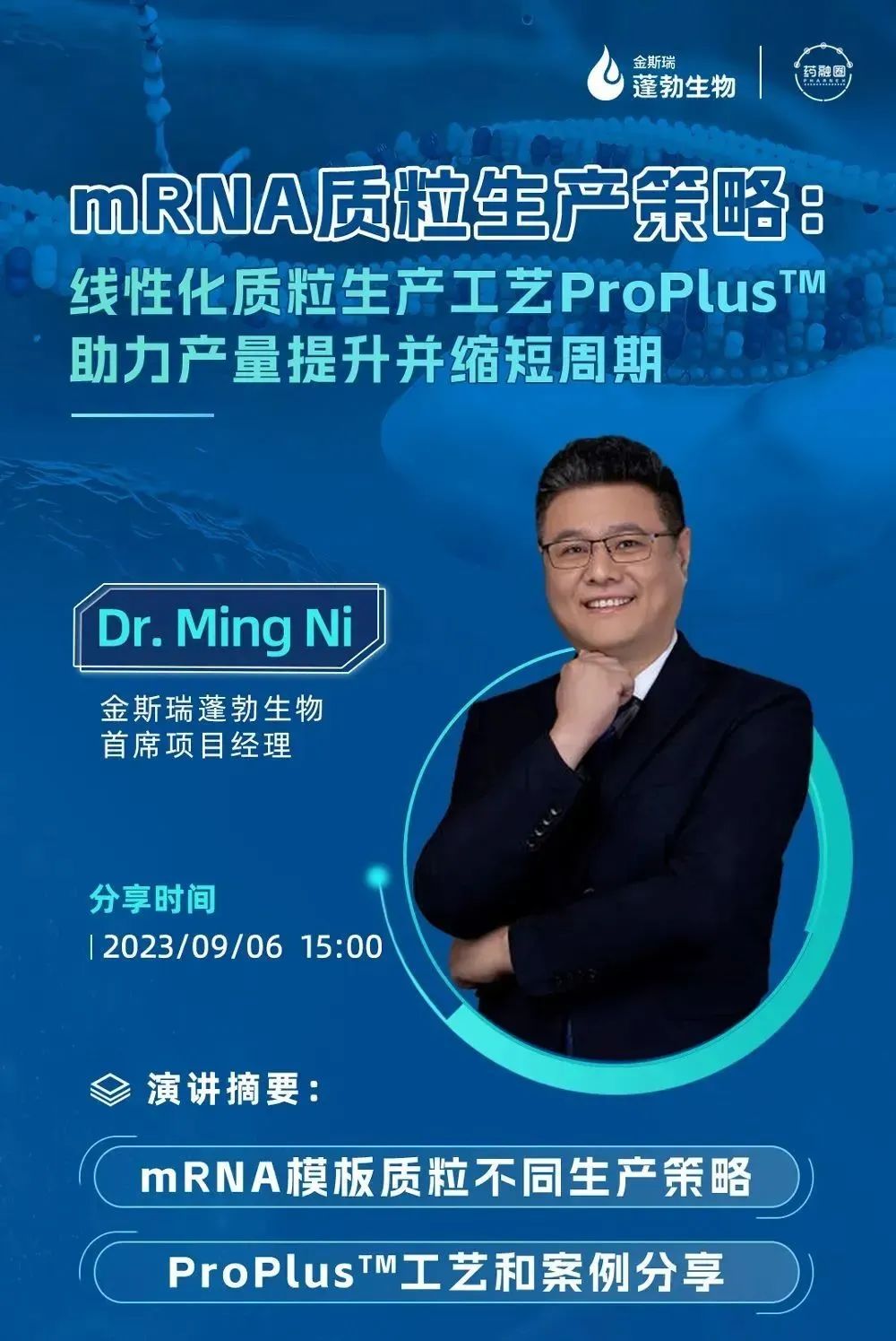 金斯瑞蓬勃生物的线性化质粒服务整体解决方案涵盖了非注册临床、工艺开发、注册临床和商业化全阶段质粒生产。ProPlus™工艺由金斯瑞蓬勃生物自主开发,并已申请专利。该工艺有着回收率高、产量高、生产周期短的特点。在保持线性化质粒高质量标准的同时,使总产量提高2~3倍,周期缩短50%。金斯瑞蓬勃生物已支持中国第一个mRNA项目获得EUA,并支持全球客户获得近40个IND临床批件。为了满足临床和商业化需求,探寻mRNA质粒生产利器,9月6日15:00,药融圈邀请金斯瑞蓬勃生物 Dr. Ming Ni 就“mRNA质粒生产策略:线性化质粒生产工艺ProPlus™,助力产量提升并缩短周期”为主题进行分享,在此次会议中,让我们一起寻找mRNA模板质粒不同的生产策略,探讨金斯瑞蓬勃生物的ProPlus™工艺。点击下方关注公众号