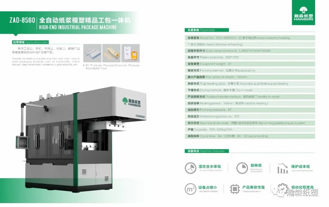 ZAD8560高端精品工包机,成型、热压一体内连续且可完成更出色、精益求精的纸塑制品,可轻易满足高产能、低能耗的运行要求,为众多客户信赖的工包首选方案。