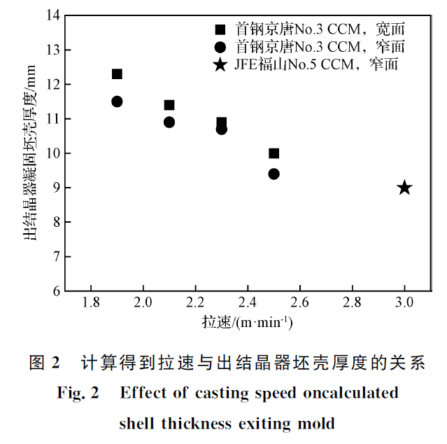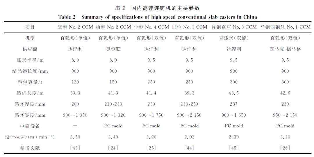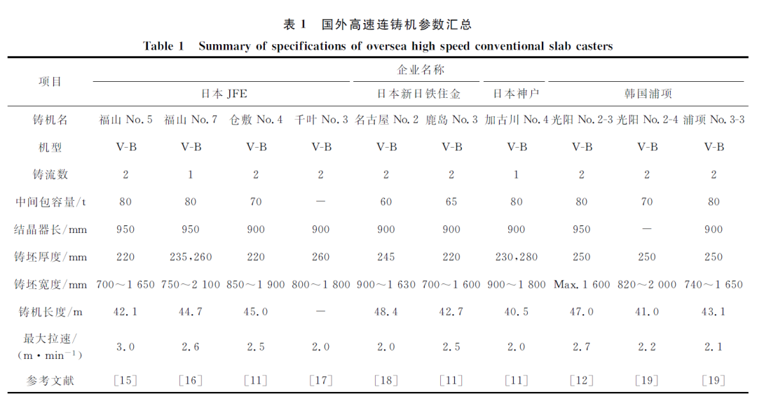 连铸技术的提出、开发与应用是继转炉炼钢之后的又一革命性炼钢技术,它极大地提高了金属产量,减少了能源消耗。尽管受到薄板坯连铸(CSP、FTSC)和薄带连铸的挑战,常规厚度板坯连铸(220~250 mm)由于压缩比大、生产质量稳定,依然是生产优质板材尤其是高品质冷轧钢板的重要手段。由于拉速是板坯厚度的函数,本文将厚度不低于220 mm、拉速不低于2.0 m/min定义为常规厚度板坯的高速连铸。在满足产品质量的条件下,提高铸机拉速意味着提产增效。高速连铸是一项综合系统性技术,它需要炼钢、精炼、连铸与轧制等各道工序密切配合,互相协作。其优势主要表现在:减少建设投资、设备损耗与人力成本;提高产量,降低成本;减少转炉、钢包与中间包耐火材料消耗,降低转炉出钢温度;减少钢/渣/耐火材料反应时间,提高钢水洁净度。由于碳含量对钢凝固特性影响很大,高速连铸技术集中应用在低碳钢与中碳亚包晶钢,本文仅讨论低碳钢(主要用于冷轧薄板)的高速连铸技术。从世界范围来看,采用2.0 m/min及以上拉速稳定连铸厚度不低于220 mm板坯的铸机主要在日本,包括JFE福山No.5、No.7铸机,JFE仓敷No.4铸机,JFE千叶No.3 铸机,新日铁住金名古屋No.2、鹿岛No.3 铸机和神户加古川No.4铸机。