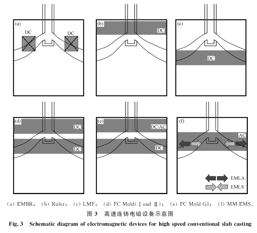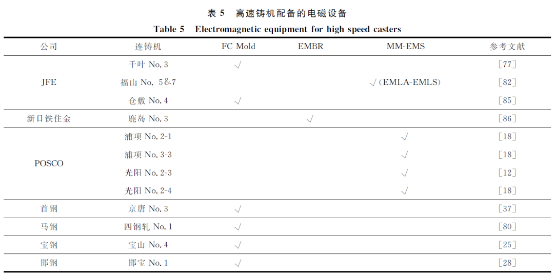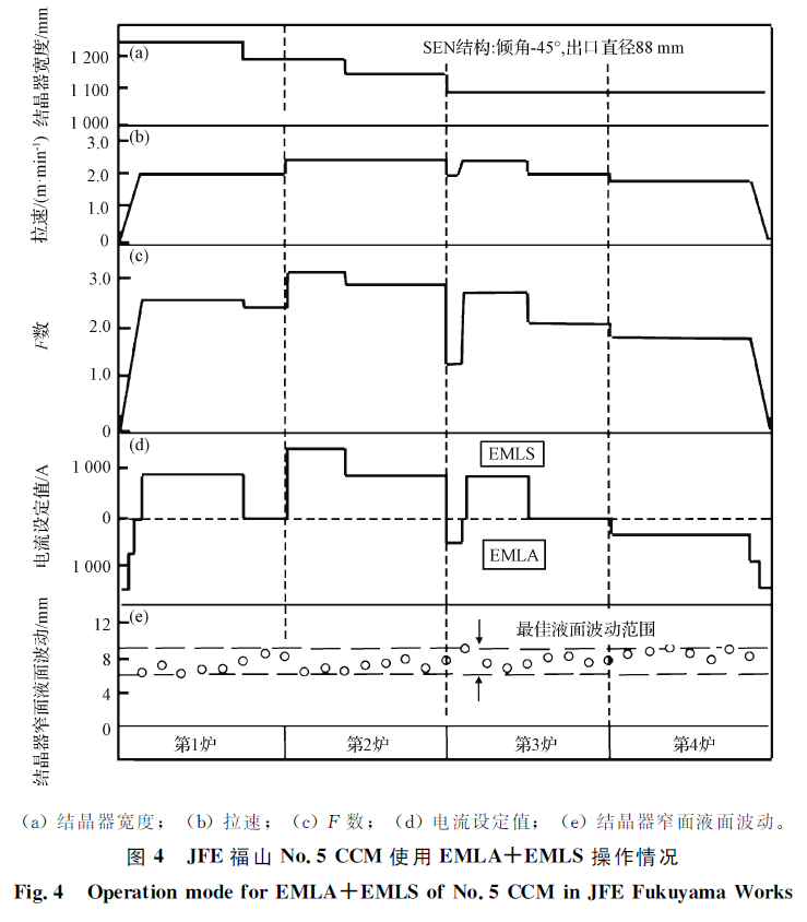 MM-EMS的前身为NKK(今JFE)开发的EMLA-EMLS(Electro Magnetic Level Accelerator+ Electro-Magnetic Level Stabilizer)技术。该装置在结晶器高度中部设置了4个电磁发生器,采用交流电源生成4个变化的电磁场(图3(f))。当浇铸速率较低时(较低拉速或窄断面连铸),钢水上回流弱,向弯月面供热不足,容易造成“钩状”坯壳发达,保护渣卷入或气孔等缺陷增多,采用EMLA加速钢水流。反之,在浇铸速率高时(高速或宽断面连铸),钢水流到达窄边附近后形成的上回流过强,容易引起保护渣卷入等问题,此时可采用EMLS对钢水流制动减速。JFE福山No.5 CCM高速连铸采用EMLA-EMLS在拉速和断面变化时的操作情况如图4所示。该厂根据“F数”大小来确定采用EMLA或EMLS。基于EMLA-EMLS技术,JFE联合Rotelec公司在2003年法国里昂召开的电磁会议上提出了一种自动在线控制系统,称为多模式电磁搅拌器(MM-EMS,即Multi-Mode EMS)。它的开发基于对钢液流场形态控制理念的发展。结晶器内流场形态主要分单股流、双股流和不稳定瞬态流。研究表明,结晶器内强度适中的双股流为最优流态。该设备具备3种电磁冶金功能:(1)EMLA;(2)EMLS;(3)EMRS。前2种功能与EMLA+EMLS相同:当结晶器流场为单股流或较弱双股流时使用EMLA将流场加速成强度适中的双股流;当流场为强度较高双股流时使用EMLS将流股减速成合理强度的流场。第3种功能搅拌结晶器上部的钢液,使其旋转并冲刷凝固前沿的夹杂物/气泡。韩国浦项公司从2001年起对板坯铸机进行改造,在其4台板坯铸机上均配备了MM-EMS。此外,据浦项报道,安装在结晶器中部的MM-EMS在使用其搅拌功能时会与主流股产生干扰。因此,浦项创新开发了可移动的MM-EMS:在使用搅拌功能时将电磁设备移动至弯月面,在使用加速或减速功能时恢复至结晶器中部位置。由于采用了MM-EMS装备等关键技术,浦项光阳No.2-3铸机浇铸250 mm厚度LCAK钢拉速提高至2.7 m/min。从前文论述可知,高速连铸电磁制动设备均朝着“多模式”、“多功能”发展。电流从单纯的“直流、交流”发展成“直流+交流”模式,冶金功能也由传统的“制动”发展成“加速+制动+搅拌”。ABB公司的FC Mold G3和Rotelec公司的MM-EMS是常规板坯结晶器电磁制动设备的典型代表。高速铸机配备的电磁设备见表5。随着中国经济进入发展转型期,钢铁工业将会面临巨大挑战,主要体现在:企业竞争日趋激烈、降低生产成本压力日益增加、环保限产日益严格。随着高速连铸漏钢预报系统和保护渣技术的进一步发展,高速连铸技术应会成为高品质冷轧薄板生产企业降本增效的有效手段。(1)高速连铸卷渣最直接控制参数是液面波动和表面速度,大倾角和凹底浸入式水口是高速连铸降低液面波动和卷渣的有效手段。(2)高速连铸电磁制动设备均朝着“多模式”、“多功能”发展。电流从单纯的“直流、交流”发展成“直流+交流”模式,冶金功能也由传统的“制动”发展成“加速+制动+搅拌”。ABB公司的FC Mold G3和Rotelec公司的MM-EMS是常规板坯结晶器电磁制动设备的典型代表。(3)尽管以首钢京唐No.3 CCM为代表的常规板坯铸机的拉速取得突破,但高速连铸稳定化技术依然是今后的研发重点。(4)国内常规板坯高速连铸技术的研究主要集中在低碳、超低碳钢等冷轧钢种。亚包晶钢的拉速与日本依然差距较大。亚包晶钢的高速连铸工艺技术将是今后的研发方向。邓小旋,潘宏伟,季晨曦,初仁生,刘清梅,朱国森.常规低碳钢板坯的高速连铸工艺技术[J].钢铁,2019,54(8):71-80.DENG Xiao-xuan,PAN Hong-wei,JI Chen-xi,CHU Ren-sheng,LIU Qing-mei,ZHU Guo-sen.Review on high speed conventional slab continuous casting of low carbon steels[J].Iron and Steel,2019,54(8):71-80.