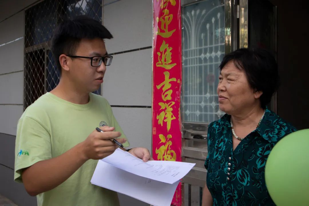 志愿者崔振奇在街边采访居民