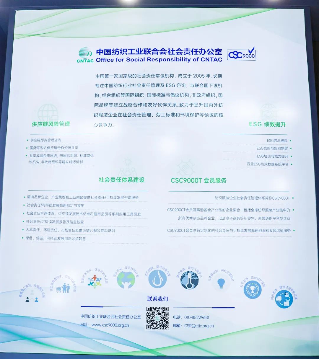 中国纺织工业联合会社会责任办公室从社会责任体系建设、供应链风险管理、ESG绩效提升、纺织服装企业社会责任管理体系(CSC 9000T)会员服务等方面助力行业企业提升在社会责任管理、劳工标准和环境保护等领域的核心竞争力。