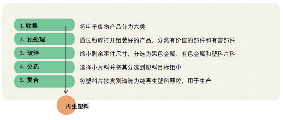 除了面向再生的设计策略,源自再生的设计(Design FROM Recycling)策略也将在闭合材料循环和实现欧盟委员会2025年的目标方面发挥关键作用。目前,大多数再生材料因质量低通常处于降级使用状态,多用于建筑、运输或基础设施建设等领域。快速增长的电气电子废物产生了大量的、种类繁多的塑料,更好地分选且保持材料的纯度成为再生工艺中的挑战。为在塑料行业实现以可持续发展为导向的创新,电气电子产品行业亟需关于面向再生和源自再生的设计指南和开发标准。相关指南对于增加再生物在消费类电气电子产品等高价值领域中的应用比例具重要意义。