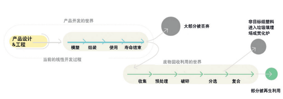 当前,这两个世界是彼此独立运作的(见图4),产品开发和废物循环过程(再生利用等)各自以线性方式进行。创建循环产品(适合再生利用并由再生材料制成)的一个重要条件是从线性方法转变为考虑整个价值链的整体方法。