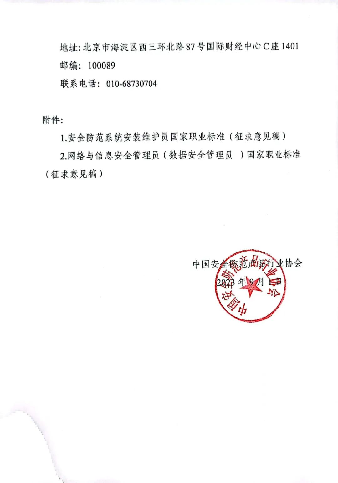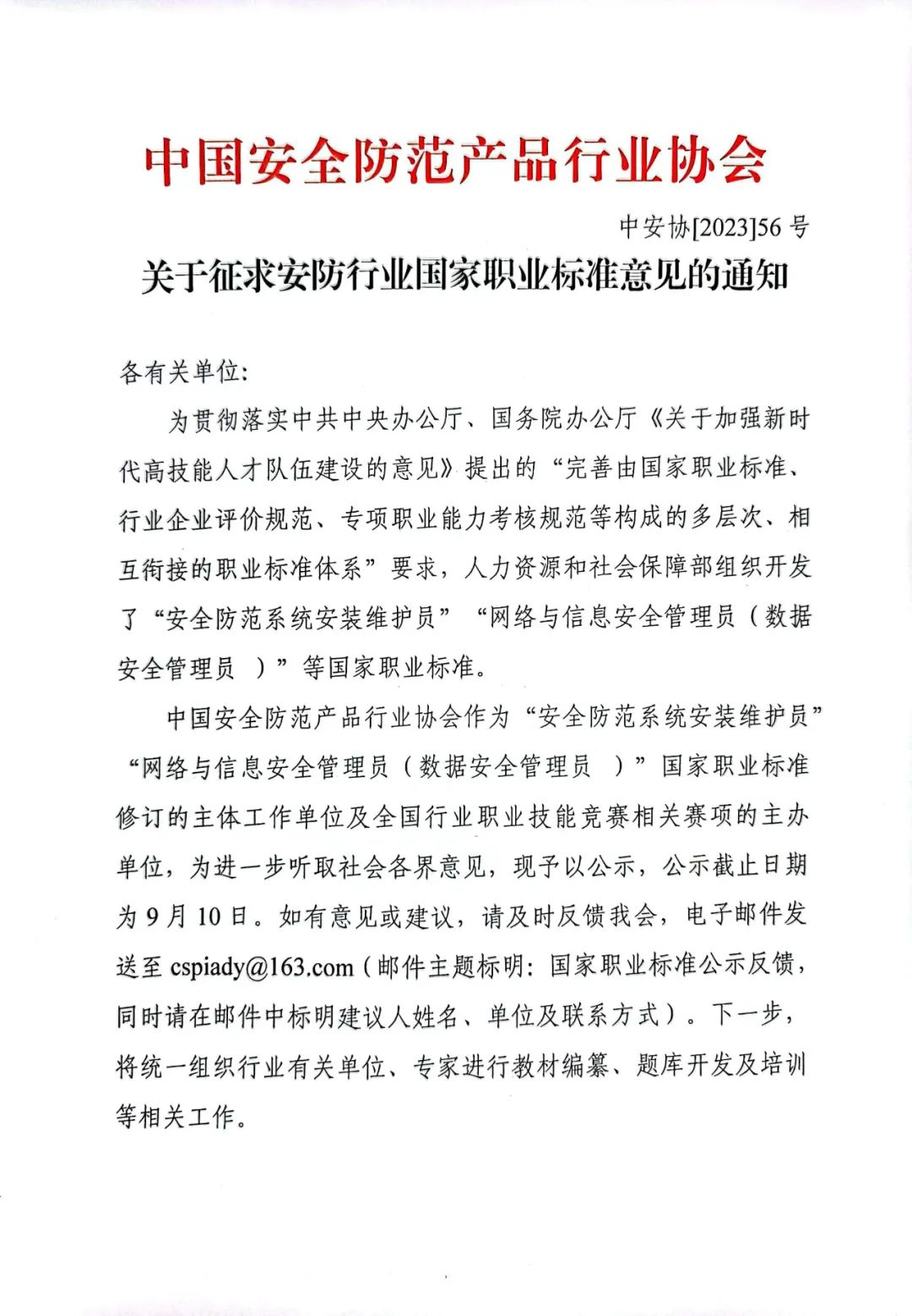 中国安全防范产品行业协会作为“安全防范系统安装维护员”“网络与信息安全管理员(数据安全管理员 )”国家职业标准修订的主体工作单位及全国行业职业技能竞赛相关赛项的主办单位,为进一步听取社会各界意见,现予以公示,公示截止日期为9月10日。如有意见或建议,请及时反馈我会,电子邮件发送至cspiady@163.com(邮件主题标明:国家职业标准公示反馈,同时请在邮件中标明建议人姓名、单位及联系方式)。下一步,将统一组织行业有关单位、专家进行教材编纂、题库开发及培训等相关工作。