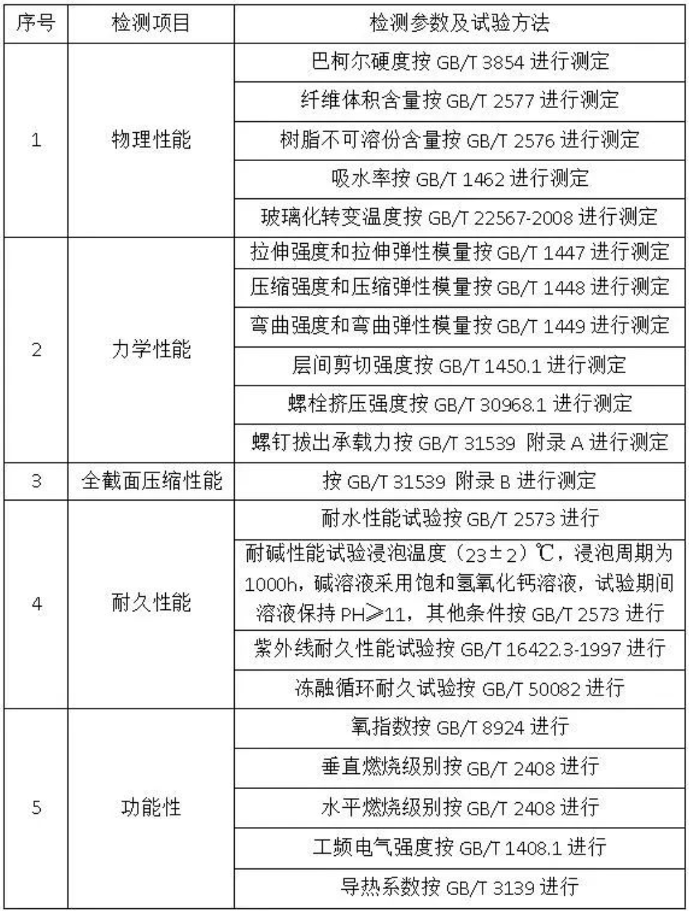 为保证产品质量,企业一般会选择第三方检验检测机构进行玻璃钢检验检测。按照标准GB/T 31539-2015《结构用纤维增强复合材料拉挤型材》,玻璃钢型材检验检测应当从物理性能、力学性能、全截面压缩性能、耐久性能和功能性等几个方面进行试验。如下表: