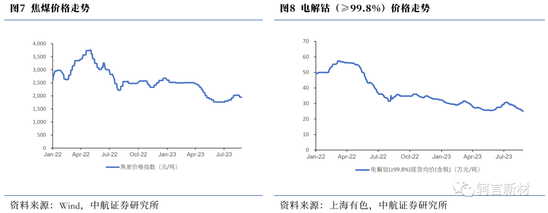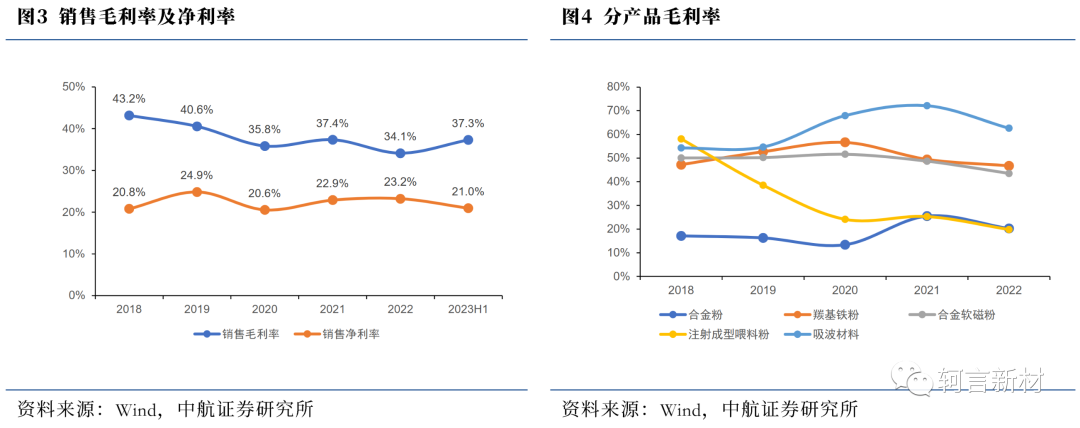 Q2盈利性企稳回升:2023H1公司销售毛利率为37.3%(同比+3.04pcts),提升较多主要由于具有高附加值的羰基铁粉及MIM喂料产品毛利占比提升,同时焦炭、钴、镍等原料价格同比下行;2023H1销售净利率为21.0%(同比-3.51pcts),与毛利率变化出现背离主要系期间费用率同比大幅上升5.06pcts所致,其中主要受管理费用率增加影响(同比+4.22pcts),主要系确认了管理人员的股份支付费用,以及商业往来活动增多、中介费用增加所致。2023Q2公司销售毛利率为37.4%(环比+0.19pcts),主要系多个产品盈利性受需求回暖而环比改善,2023Q2销售净利率为21.2%(环比+0.43pcts),净利率环比增长相对更多主要由于Q2期间费用率环比大幅下降4.30pcts,其中财务费用率环比下降3.39pcts主要系存款利息收入及贷款贴息所致;