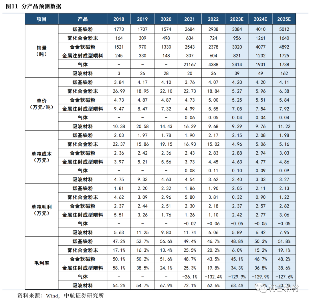 产能规划明确量级增长,有望大幅抬升市场空间:当前公司具有约1.3万吨微纳金属粉体系列产品年产能,IPO募投项目“年产6,000吨羰基铁粉等系列产品项目(一期)”和“高性能超细金属及合金粉末扩建项目”预计于2023年9月达产,羰基铁粉产能将增加6,000吨至11,200吨,高性能超细金属及合金粉末产能将共计扩充4000吨,近翻倍式的产能扩张将进一步强化公司在细分行业的龙头地位。公司于2023年6月发布公告,计划投资不超过30亿元,在“创新工艺年产3,000吨羰基铁粉生产示范线项目”基础上,于宁夏追加投资累计建设“年产10万吨金属软磁微纳粉体项目”,项目建设周期为36个月,并计划在2025/2027/2029年分别投产3,000/27,000/70,000吨羰基铁粉年产能(计算可得2022-2029年产能扩张CAGR约为55%)。项目基于公司多年的工艺技术和经验积累,计划在保持产品40%+毛利率的前提下,将基础版羰基铁粉售价从目前的4万元/吨降至2万元/吨左右。一方面,低成本羰基铁粉方案可形成对电解、雾化等较低性能竞品工艺直接进行部分或者完全替代,从而切入全新的应用领域,另一方面,现有应用领域中羰基铁粉渗透的广度和深度均能得到提升,未来羰基铁粉市场容量的天花板有望呈指数级抬升。