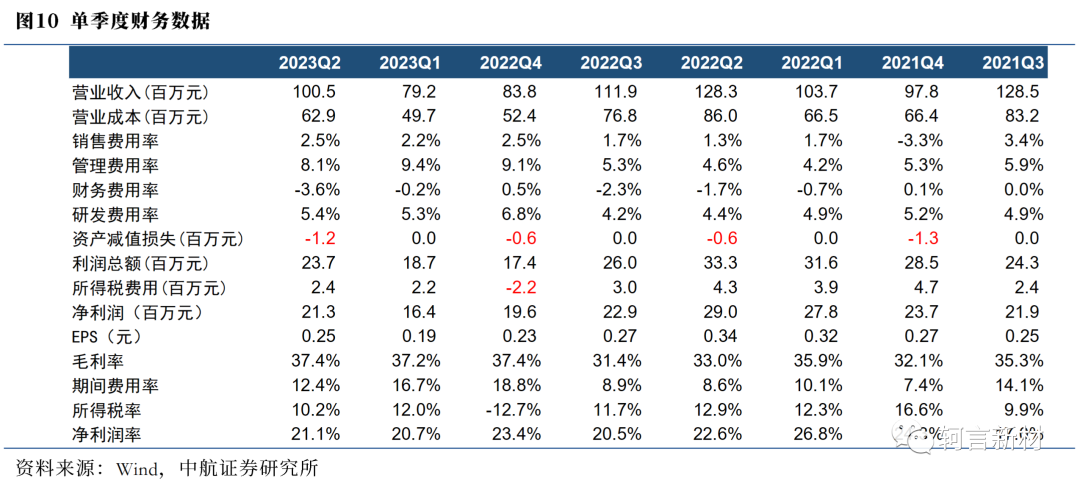 公司2023年上半年实现营业收入1.80亿元(同比-22.6%),实现归母净利润3792万元(同比-32.4%),扣非后归母净利润为3356万元(同比-30.6%),对应基本EPS为0.44元。其中,公司Q2实现营收1.01亿元(同比-21.7%,环比+27.0%),归母净利润2154万元(同比-26.0%,环比+31.4%),单季度基本EPS为0.25元。