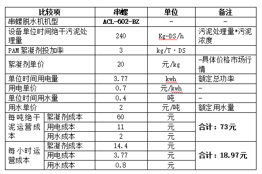 以某自来水厂串螺脱水机实际运营数据为例,统计吨绝干泥和每小时运营成本如下表所示: