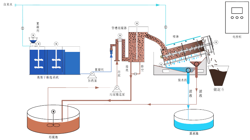 均质池内经过浓缩的污泥和泡药装置内经过熟化的絮凝剂通过相应的输送泵同步输入串螺脱水机高效管槽絮凝器,通过高速搅凝管的高速运转形成强劲的紊流,使污泥和絮凝剂快速混合,反复碰撞瞬间凝集,流入低速混凝器低速搅拌,使污泥形成更结实稳定的絮团。
