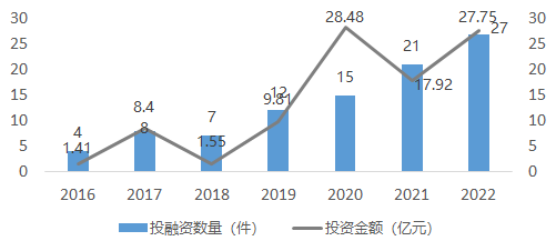 2016-2022年我国数字孪生投融资事件数总体呈现波动上涨趋势,从2016年的4起增加到2022年的27件。2022年,我国数字孪生行业发生投融资事件27件,投资金额达27.75亿元。