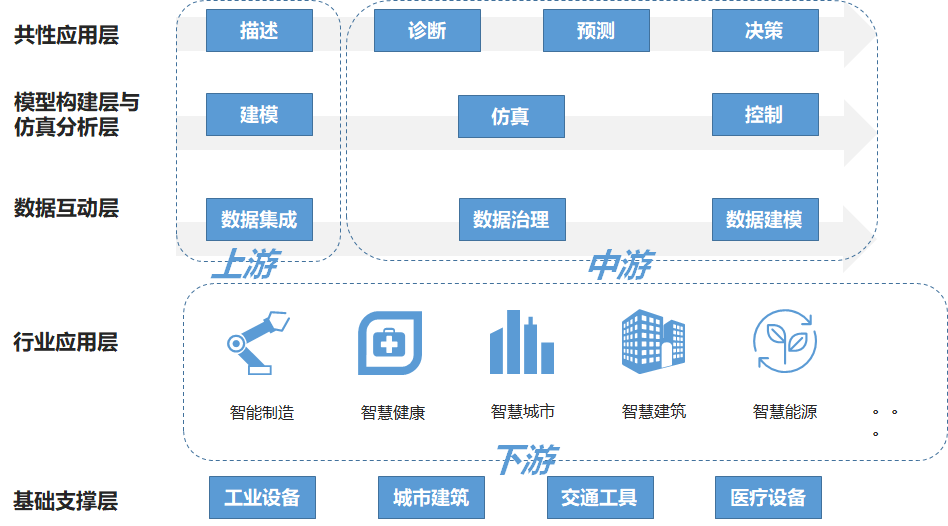 数字孪生技术作为推动实现企业数字化转型、促进数字经济发展的重要抓手,已建立了普遍适应的理论技术体系,并在产品设计制造、工程建设和其他学科分析等领域有较为深入的应用,其相关产业链条如下: