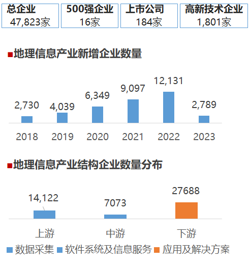 我国地理信息产业市场发展向好,也吸引了众多的企业参与其中。当前企业数量达到约47823家,但值得注意的是,虽然我国地理信息产业参与企业数量多,但目前市场相对分散,企业主要集中在下游,产业生态有待进一步完善。