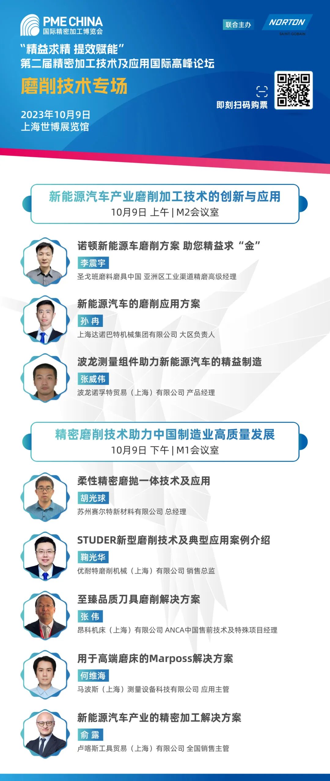 “精益求精,提效赋能”第二届精密加工技术及应用国际高峰论坛即将盛大开幕!本期揭晓“磨削技术专场”议题,敬请关注10月9日上午“新能源汽车产业磨削加工技术的创新与应用”论坛和10月9日下午“精密磨削技术助力中国制造业高质量发展”论坛,论坛详情请看下图~
